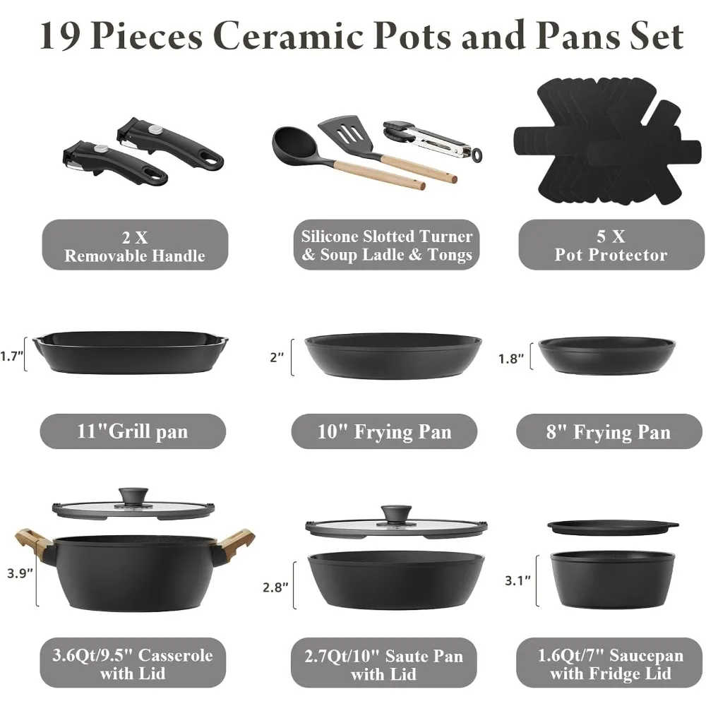 19 Pcs Pots and Pans Set Non Stick Ceramic Cookware Set with Removable Handles, Non Toxic Induction Kitchen Cookware Sets RV Coo