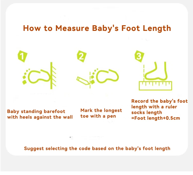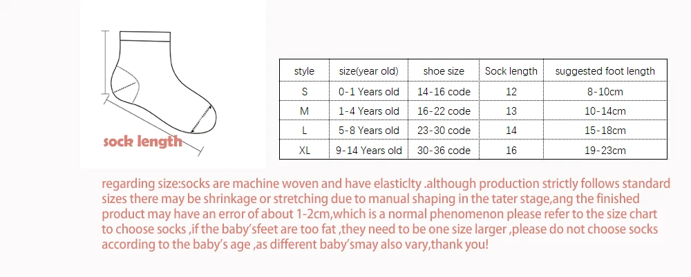 1. Regarding size: Socks are machine woven and have elasticity. Although production strictly follows standard dimensions, there may be shrinkage or stretching due to manual pulling in the later stage, and the finished product may have an error of about 1-2mm. This is a normal phenomenon. If the baby is overweight or concerned about size, they can choose a larger size. Thank you.