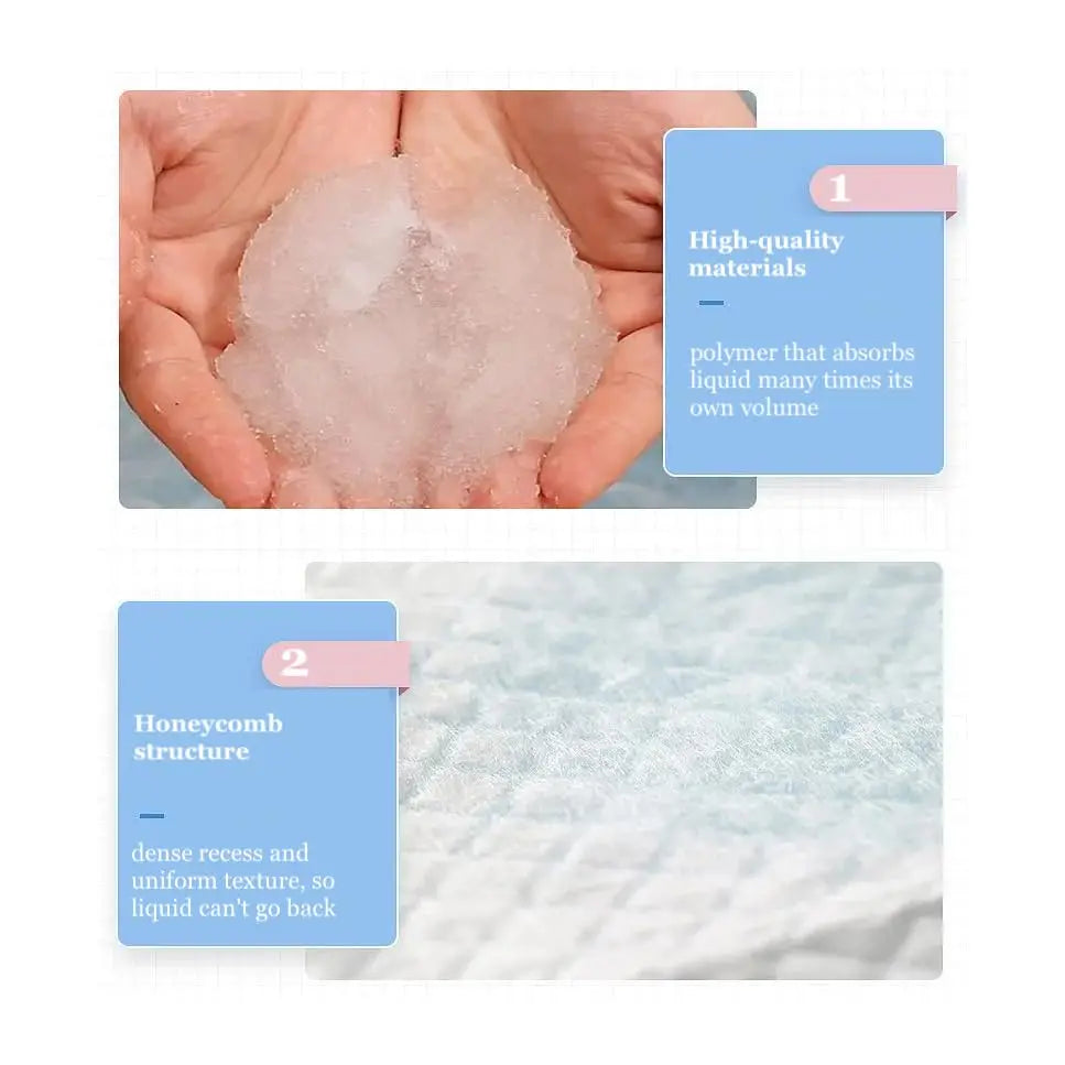 5 Layers of Protection: 1. Non-woven Fabric – soft and breathable for your pet's comfort. 2. Tissue Paper – adds an extra layer of absorbency. 3. Fluff Pulp & Super Absorbent Polymer – locks in moisture effectively. 4. Tissue Paper – enhances absorbency further. 5. Waterproof PE Film – provides a reliable barrier against leaks.